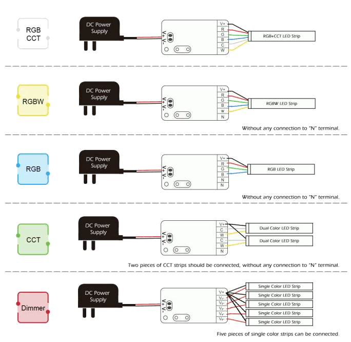 • Control de las tiras LED monocolor, CCT, RGB, RGBW(W) y RGBCCT